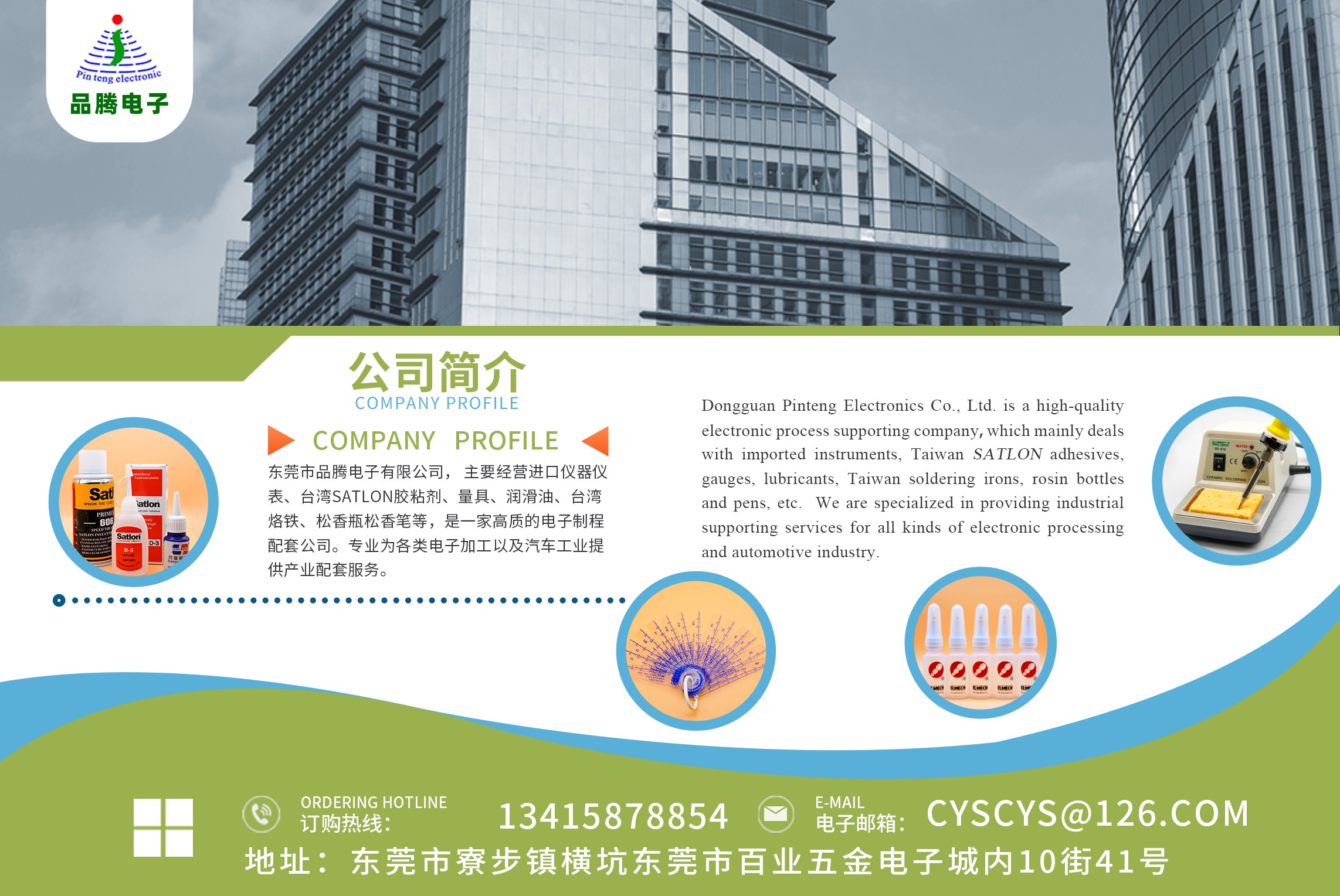 東莞市品騰電子有限公司, 主要經(jīng)營進(jìn)口儀器儀表、臺(tái)灣Satlon膠粘劑、量具、潤滑油、臺(tái)灣烙鐵、松香瓶松香筆等,是一家高質(zhì)的電子制程配套公司。專業(yè)為各類電子加工業(yè)以及汽車工業(yè)提供產(chǎn)業(yè)配套服務(wù)。